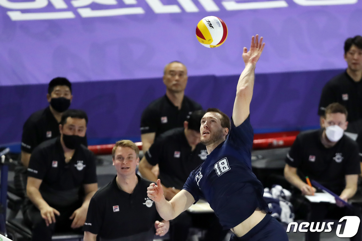 (인천=뉴스1) 황기선 기자 = 30일 오후 인천 계양체육관에서 열린 프로배구 도드람 2022-2023 V리그 챔피언결정전 1차전 남자부 대한항공과 현대캐피탈의 경기에서 대한항공 링컨이 스파이크를 날리고 있다. 2023.3.30/뉴스1