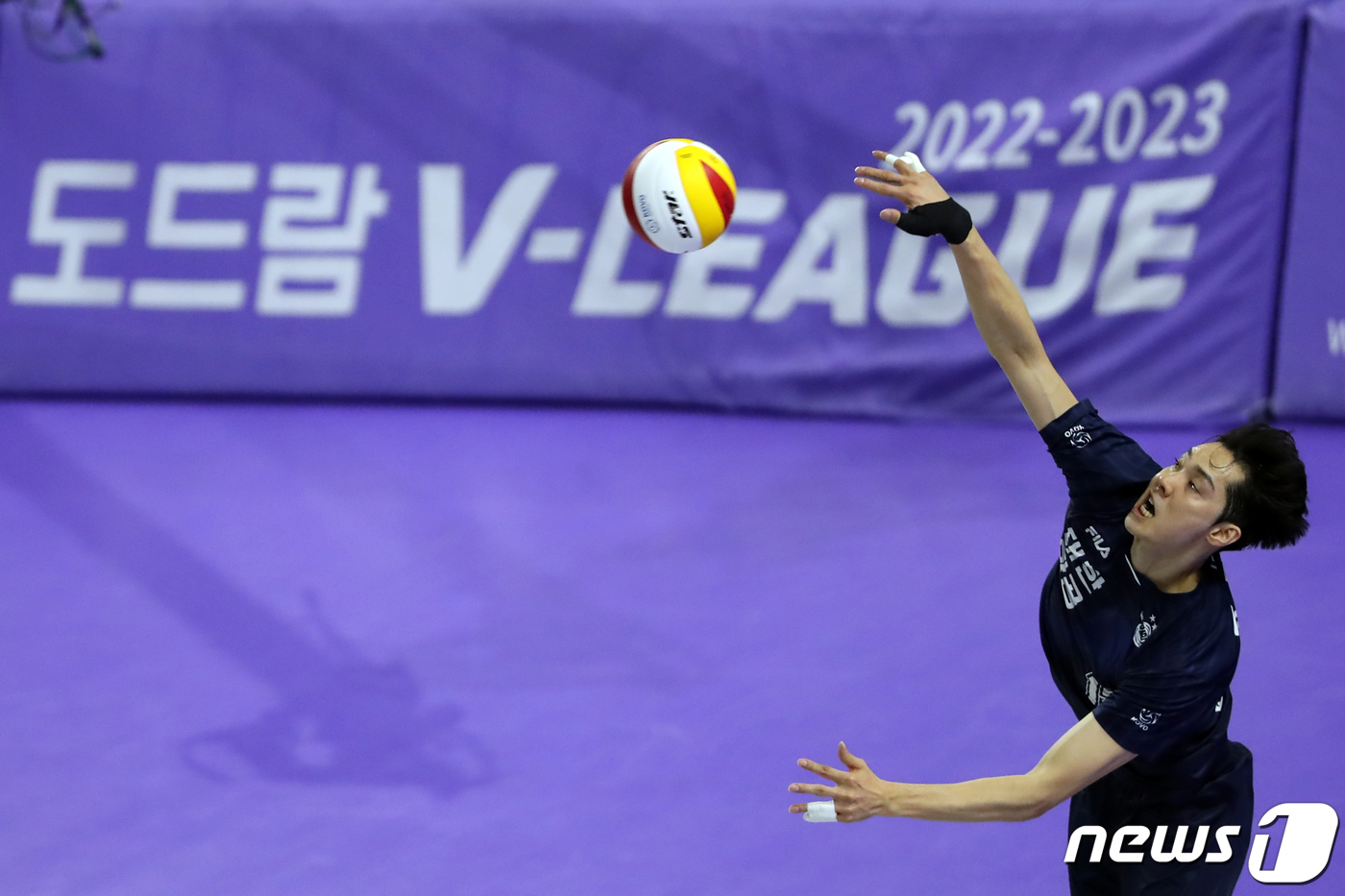 (인천=뉴스1) 황기선 기자 = 30일 오후 인천 계양체육관에서 열린 프로배구 도드람 2022-2023 V리그 챔피언결정전 1차전 남자부 대한항공과 현대캐피탈의 경기에서 대한항공 조재영이 서브를 하고 있다. 2023.3.30/뉴스1