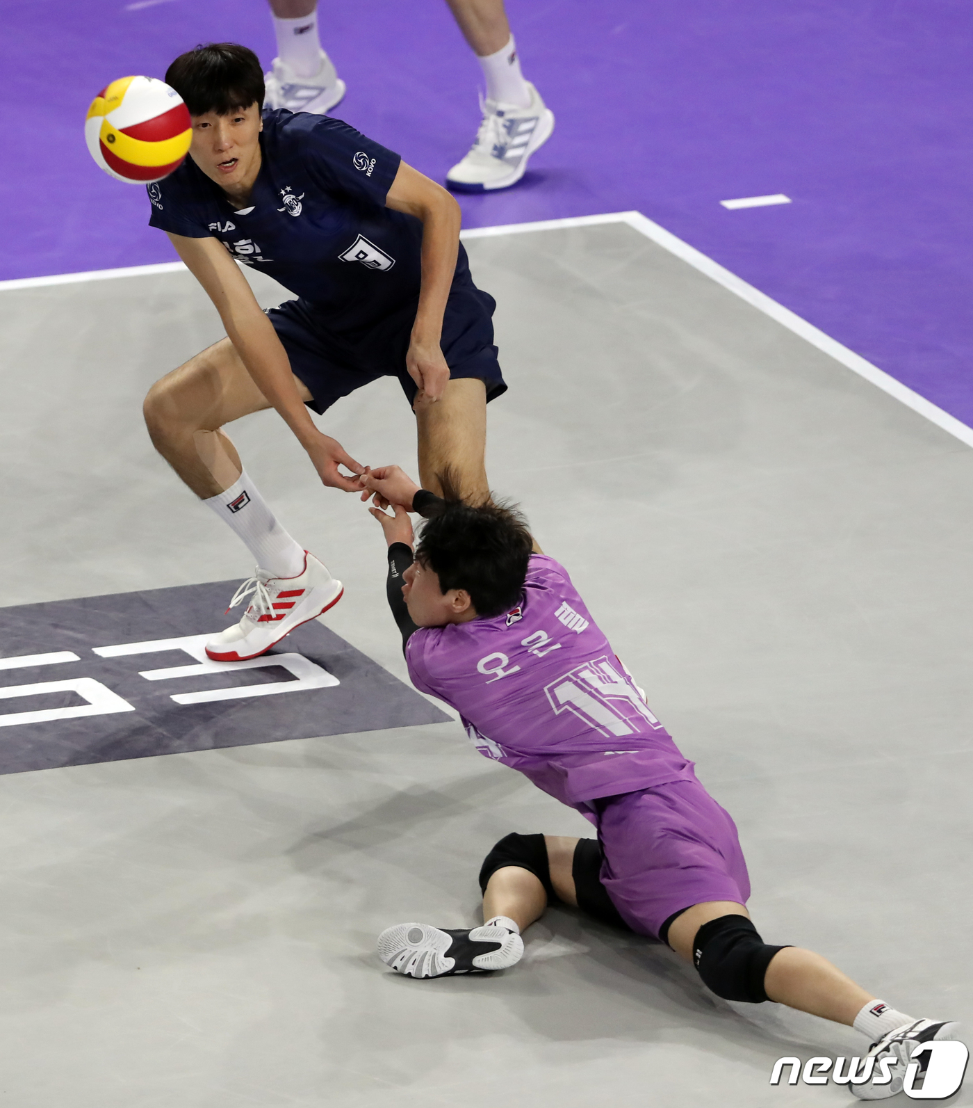 (인천=뉴스1) 황기선 기자 = 30일 오후 인천 계양체육관에서 열린 프로배구 도드람 2022-2023 V리그 챔피언결정전 1차전 남자부 대한항공과 현대캐피탈의 경기에서 대한항공 오은렬이 리시브를 하고 있다. 2023.3.30/뉴스1