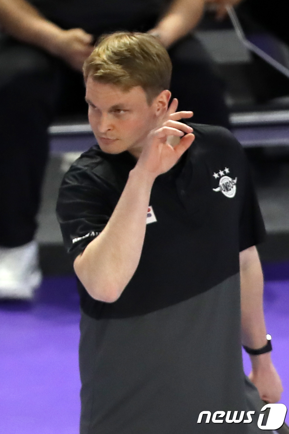 (인천=뉴스1) 황기선 기자 = 30일 오후 인천 계양체육관에서 열린 프로배구 도드람 2022-2023 V리그 챔피언결정전 1차전 남자부 대한항공과 현대캐피탈의 경기에서 토미 틸리카이넨 대한항공 감독이 경기를 지켜보고 있다. 2023.3.30/뉴스1