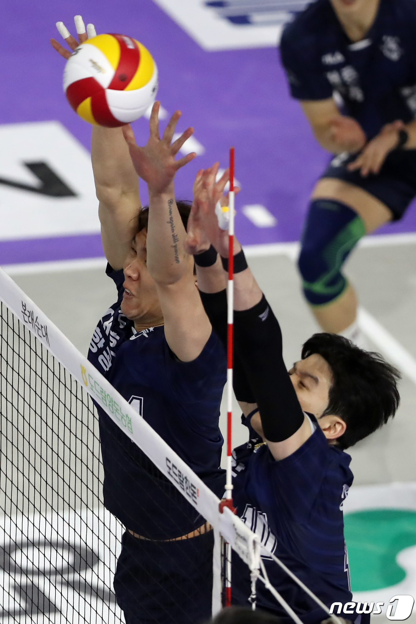 (인천=뉴스1) 황기선 기자 = 30일 오후 인천 계양체육관에서 열린 프로배구 도드람 2022-2023 V리그 챔피언결정전 1차전 남자부 대한항공과 현대캐피탈의 경기에서 대한항공 김규민과 정지석이 블로킹 시도를 하고 있다. 2023.3.30/뉴스1