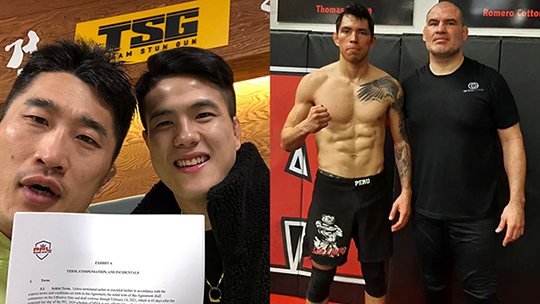 | 조성빈이 UFC 출신 방송인 김동현(왼쪽)과 함께한 자리에서 PFL 계약서를 보여주고 있다. / 헤수스 피네도는 전 UFC 챔피언 케인 벨라스케스(오른쪽)와 훈련 중이다. 사진=Team Stun Gun & American Kickboxing Academy 제공 |