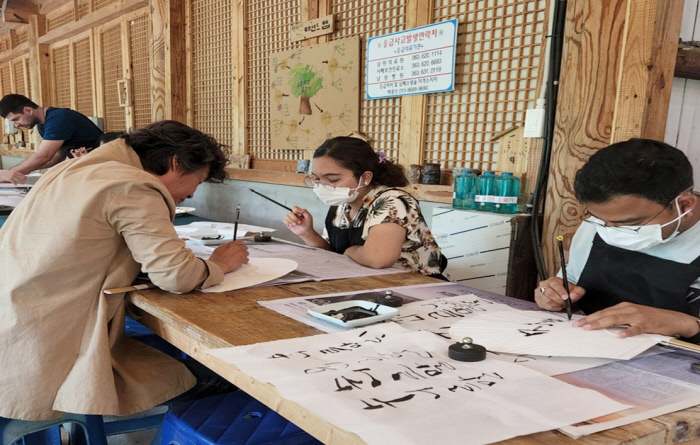 농림수산식품교육문화정보원은 올해도 7월부터 국민 누구나 참여할 수 있는 6차산업 체험프로그램을 운영한다. 사진은 전북 남원시의 혼불체험관에서 서예 체험을 하고 있는 관광객들. |