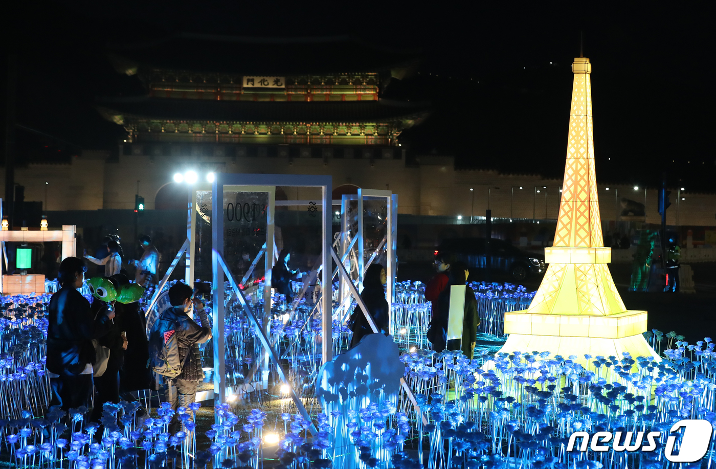 (서울=뉴스1) 김진환 기자 = 30일 오후 서울 종로구 광화문광장에서 열린 '광화에서 빛; 나이다'를 찾은 시민들이 불 밝힌 LED 장미를 살펴보고 있다. 이번 행사는 세계 3대 메가이벤트인 월드엑스포 유치 한국 실사를 앞두고 대한민국 국민들의 엑스포 유치 열망을 국내외에 알리기 위해 마련됐다. 행사 타이틀인 ‘광화에서 빛;나이다’는 역대 엑스포 상징물들을 빛나는 조형물로 구현하여 보여준다는 의미와 2030세계박람회 부산 유치를 기원하는 ‘비나이다’라는 중의적 의미를 담고 있다. 2023.3.30/뉴스1