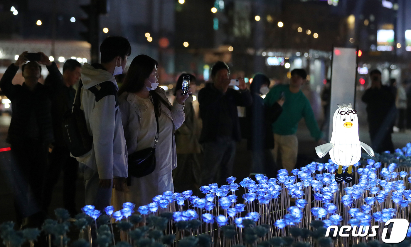(서울=뉴스1) 김진환 기자 = 30일 오후 서울 종로구 광화문광장에서 열린 '광화에서 빛; 나이다'를 찾은 시민들이 불 밝힌 LED 장미를 살펴보고 있다. 이번 행사는 세계 3대 메가이벤트인 월드엑스포 유치 한국 실사를 앞두고 대한민국 국민들의 엑스포 유치 열망을 국내외에 알리기 위해 마련됐다. 행사 타이틀인 ‘광화에서 빛;나이다’는 역대 엑스포 상징물들을 빛나는 조형물로 구현하여 보여준다는 의미와 2030세계박람회 부산 유치를 기원하는 ‘비나이다’라는 중의적 의미를 담고 있다. 2023.3.30/뉴스1