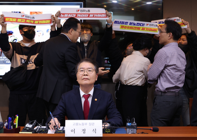 지난 15일 '근로시간 관리 우수 사업장 노사간담회'에서 민주노총 청년 노동자들은 간담회에 기습 방문해 "노동자를 과로사로 내몰지 말고 폐기를 확답해달라"며 시위를 벌였다. 이때 이 장관은 "의견이 다를 수 있다"며 "나중에 말씀하실 기회를 드릴 것"이라고 말했다. (관련기사 : '주 69시간'에 분노한 청년들 기습시위…이정식 "의견 다를 수 있어")