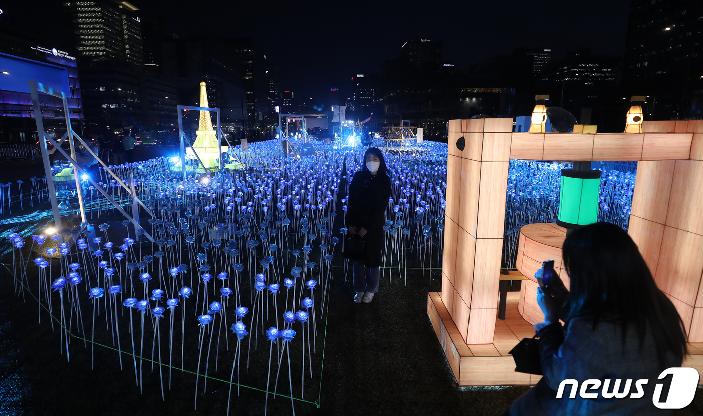 (서울=뉴스1) 김진환 기자 = 30일 오후 서울 종로구 광화문광장에서 열린 '광화에서 빛; 나이다'를 찾은 시민들이 불 밝힌 LED 장미를 살펴보고 있다. 이번 행사는 세계 3대 메가이벤트인 월드엑스포 유치 한국 실사를 앞두고 대한민국 국민들의 엑스포 유치 열망을 국내외에 알리기 위해 마련됐다. 행사 타이틀인 ‘광화에서 빛;나이다’는 역대 엑스포 상징물들을 빛나는 조형물로 구현하여 보여준다는 의미와 2030세계박람회 부산 유치를 기원하는 ‘비나이다’라는 중의적 의미를 담고 있다. 2023.3.30/뉴스1