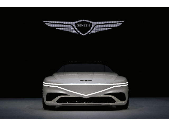 전면은 제네시스 대표 디자인 요소인 크레스트 그릴을 재해석한 긴 두 줄의 헤드램프가 눈길을 사로잡았다. 측면부는 긴 보닛과 짧은 프론트 오버행(front overhang), 여유 있는 대시 투 액슬(dash to axle), 긴 휠베이스로 위엄 있는 모습을 연출했다.