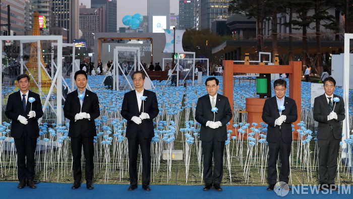 [서울=뉴스핌] 정일구 기자 = 한덕수 국무총리가 30일 오후 서울 종로구 광화문광장에서 열린 2030 부산세계박람회(엑스포) 유치기원 '광화에서 빛;나이다' 점등식에서 참석자들과 점등 퍼포먼스를 하고 있다. 왼쪽 두번째부터 장성민 대통령실 미래전략기획관, 한 총리, 이창양 산업통상자원부 장관, 윤상직 2030 부산엑스포 유치위원회 사무총장, 안병윤 부산시 행정부시장. 2023.03.30 mironj19@newspim.com