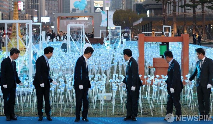 [서울=뉴스핌] 정일구 기자 = 한덕수 국무총리가 30일 오후 서울 종로구 광화문광장에서 열린 2030 부산세계박람회(엑스포) 유치기원 '광화에서 빛;나이다' 점등식에서 참석자들과 점등 퍼포먼스를 하고 있다. 왼쪽 두번째부터 장성민 대통령실 미래전략기획관, 한 총리, 이창양 산업통상자원부 장관, 윤상직 2030 부산엑스포 유치위원회 사무총장, 안병윤 부산시 행정부시장. 2023.03.30 mironj19@newspim.com