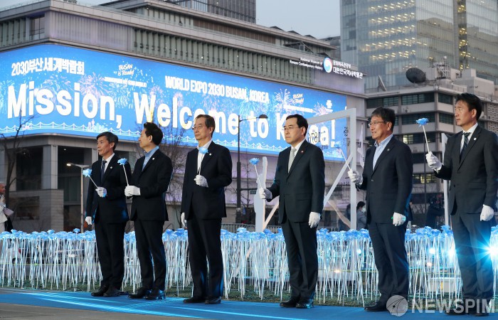 [서울=뉴스핌] 정일구 기자 = 한덕수 국무총리가 30일 오후 서울 종로구 광화문광장에서 열린 2030 부산세계박람회(엑스포) 유치기원 '광화에서 빛;나이다' 점등식에서 참석자들과 점등 퍼포먼스를 하고 있다. 왼쪽 두번째부터 장성민 대통령실 미래전략기획관, 한 총리, 이창양 산업통상자원부 장관, 윤상직 2030 부산엑스포 유치위원회 사무총장, 안병윤 부산시 행정부시장. 2023.03.30 mironj19@newspim.com