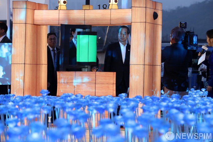 [서울=뉴스핌] 정일구 기자 = 한덕수 국무총리가 30일 오후 서울 종로구 광화문광장에서 열린 2030 부산세계박람회(엑스포) 유치기원 '광화에서 빛;나이다' 점등식에 참석해 조형물을 관람하고 있다. 2023.03.30 mironj19@newspim.com