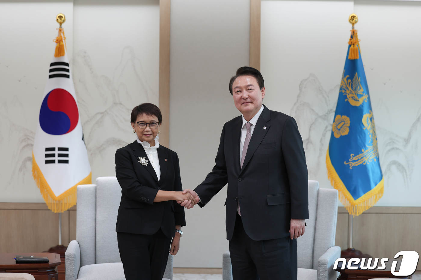 (서울=뉴스1) 오대일 기자 = 윤석열 대통령이 30일 용산 대통령실 청사에서 레트노 마르수디(Retno Marsudi) 인도네시아 외교장관을 접견하며 기념촬영을 하고 있다. (대통령실 제공) 2023.3.30/뉴스1