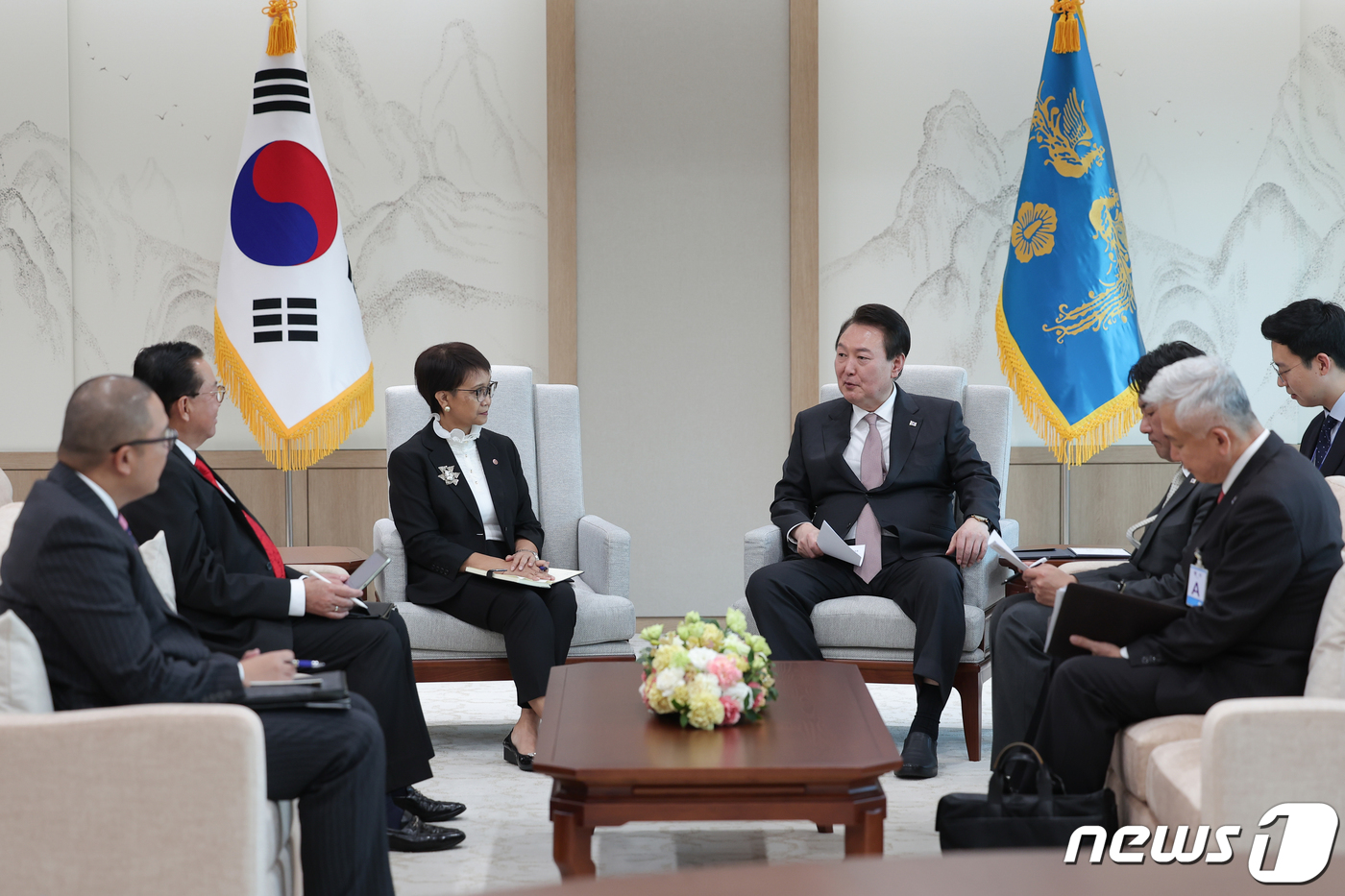 (서울=뉴스1) 오대일 기자 = 윤석열 대통령이 30일 용산 대통령실 청사에서 레트노 마르수디(Retno Marsudi) 인도네시아 외교장관을 접견하고 있다. (대통령실 제공) 2023.3.30/뉴스1