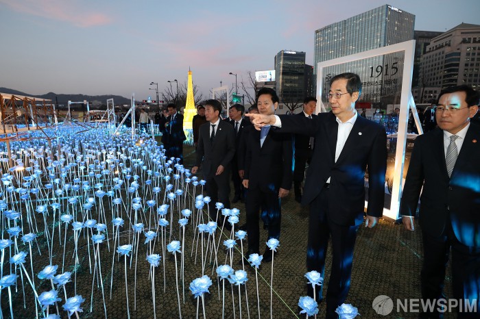[서울=뉴스핌] 정일구 기자 = 한덕수 국무총리가 30일 오후 서울 종로구 광화문광장에서 열린 2030 부산세계박람회(엑스포) 유치기원 '광화에서 빛;나이다' 점등식에 참석해 조형물을 관람하고 있다. 2023.03.30 mironj19@newspim.com