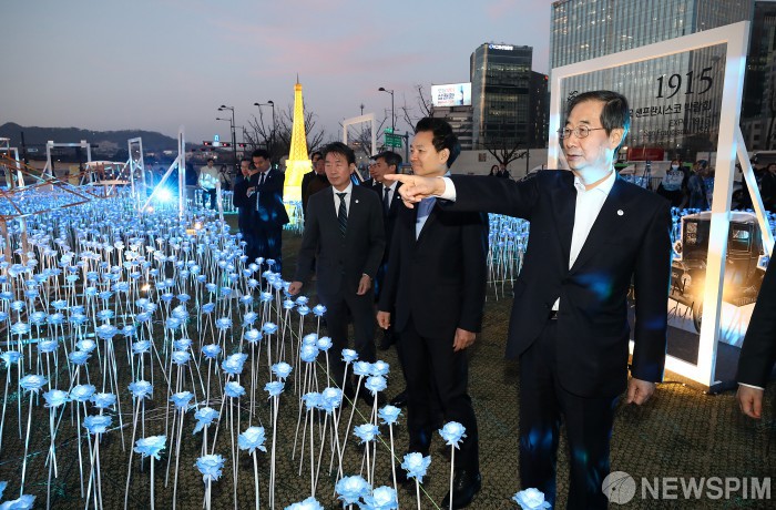 [서울=뉴스핌] 정일구 기자 = 한덕수 국무총리가 30일 오후 서울 종로구 광화문광장에서 열린 2030 부산세계박람회(엑스포) 유치기원 '광화에서 빛;나이다' 점등식에 참석해 조형물을 관람하고 있다. 2023.03.30 mironj19@newspim.com