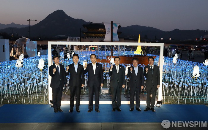 [서울=뉴스핌] 정일구 기자 = 한덕수 국무총리가 30일 오후 서울 종로구 광화문광장에서 열린 2030 부산세계박람회(엑스포) 유치기원 '광화에서 빛;나이다' 점등식에서 참석자들과 기념촬영을 하고 있다. 왼쪽 두번째부터 장성민 대통령실 미래전략기획관, 한 총리, 이창양 산업통상자원부 장관, 윤상직 2030 부산엑스포 유치위원회 사무총장, 안병윤 부산시 행정부시장. 2023.03.30 mironj19@newspim.com