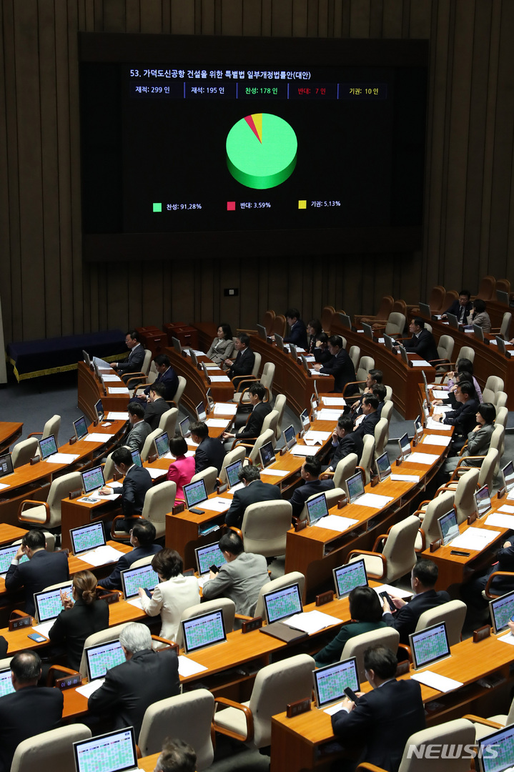 '가덕도신공항 건설을 위한 특별법 일부개정법률안 대안(가덕도 신공항법)'도 재석 195인 가운데 찬성 178인, 반대 7인, 기권 10인으로 통과됐다. 이 법안 통과에 따라 최소 12개월에서 24개월 이상 사업추진 기간 단축이 예상된다.