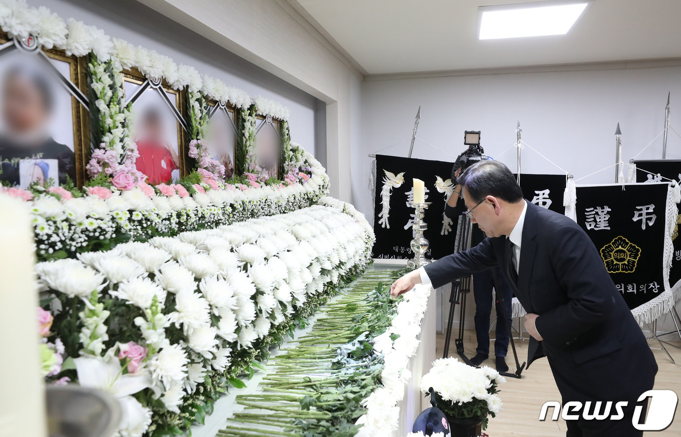 (안산=뉴스1) 김영운 기자 = 주호영 국민의힘 원내대표가 30일 오후 경기 안산시 단원구 군자장례식장에 마련된 다세대주택에서 발생한 화재로 숨진 나이지리아 국적 4남매의 빈소를 찾아 조문을 하고 있다. 2023.3.30/뉴스1