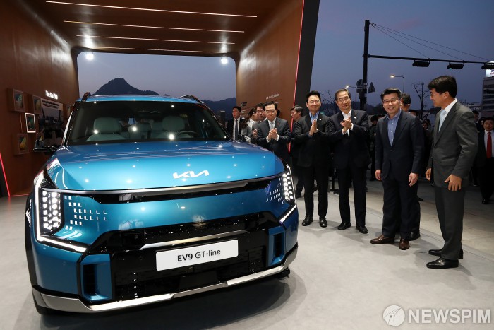 [서울=뉴스핌] 정일구 기자 = 한덕수 국무총리가 30일 오후 서울 종로구 광화문광장에서 열린 2030 부산세계박람회(엑스포) 유치기원 '광화에서 빛;나이다' 점등식에 참석해 기아 부스에 전시된 첫 대형 전기차 'EV9'을 살펴보고 있다. 2023.03.30 mironj19@newspim.com
