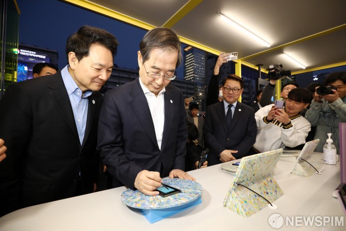 [서울=뉴스핌] 정일구 기자 = 한덕수 국무총리가 30일 오후 서울 종로구 광화문광장에서 열린 2030 부산세계박람회(엑스포) 유치기원 '광화에서 빛;나이다' 점등식에 참석해 삼성전자 부스에서 갤럭시 S23에 메시지를 남기고 있다. 2023.03.30 mironj19@newspim.com