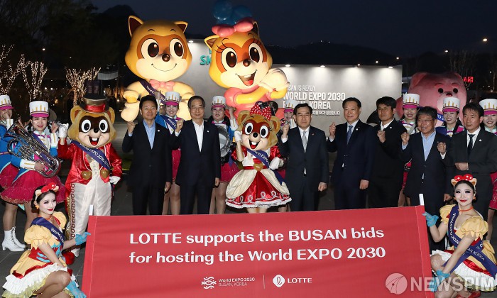 [서울=뉴스핌] 정일구 기자 = 한덕수 국무총리가 30일 오후 서울 종로구 광화문광장에서 열린 2030 부산세계박람회(엑스포) 유치기원 '광화에서 빛;나이다' 점등식에 참석해 롯데 부스 관계자들과 기념촬영을 하고 있다. 2023.03.30 mironj19@newspim.com