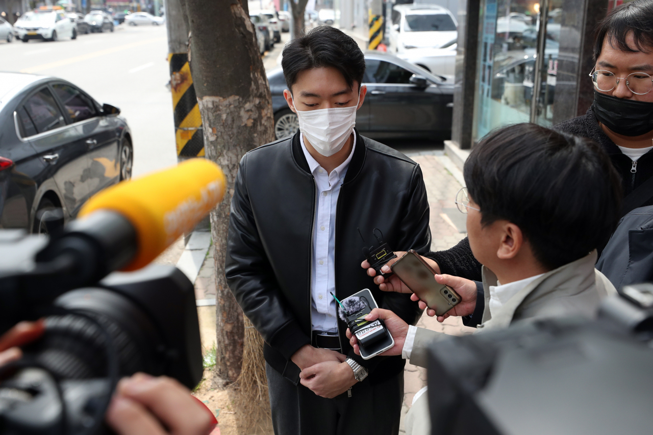 전직 대통령 고(故) 전두환 씨의 손자 전우원 씨가 30일 낮 광주 서구 쌍촌동 거리에서 기자들 질문에 답하고 있다. 마약 투약 혐의로 경찰에 체포됐다가 전날 석방된 전씨는 이날 광주를 방문했고, 5·18 민주화운동 피해자와 유가족 등을 만날 예정이다. 연합뉴스 |