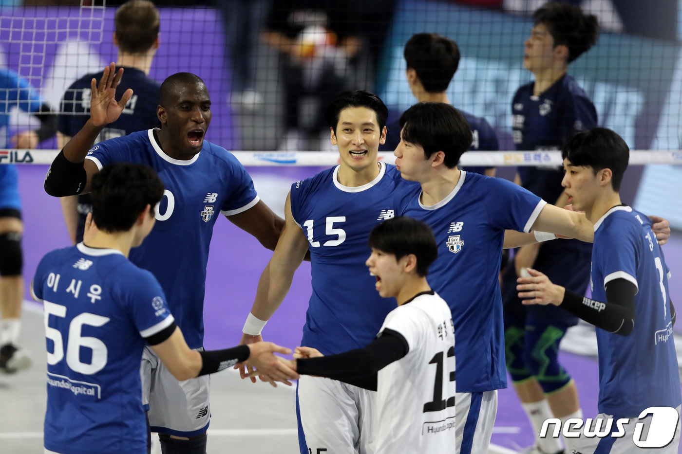 (인천=뉴스1) 황기선 기자 = 30일 오후 인천 계양체육관에서 열린 프로배구 도드람 2022-2023 V리그 챔피언결정전 1차전 남자부 대한항공과 현대캐피탈의 경기에서 득점에 성공한 현대캐피탈 선수들이 기뻐하고 있다. 2023.3.30/뉴스1