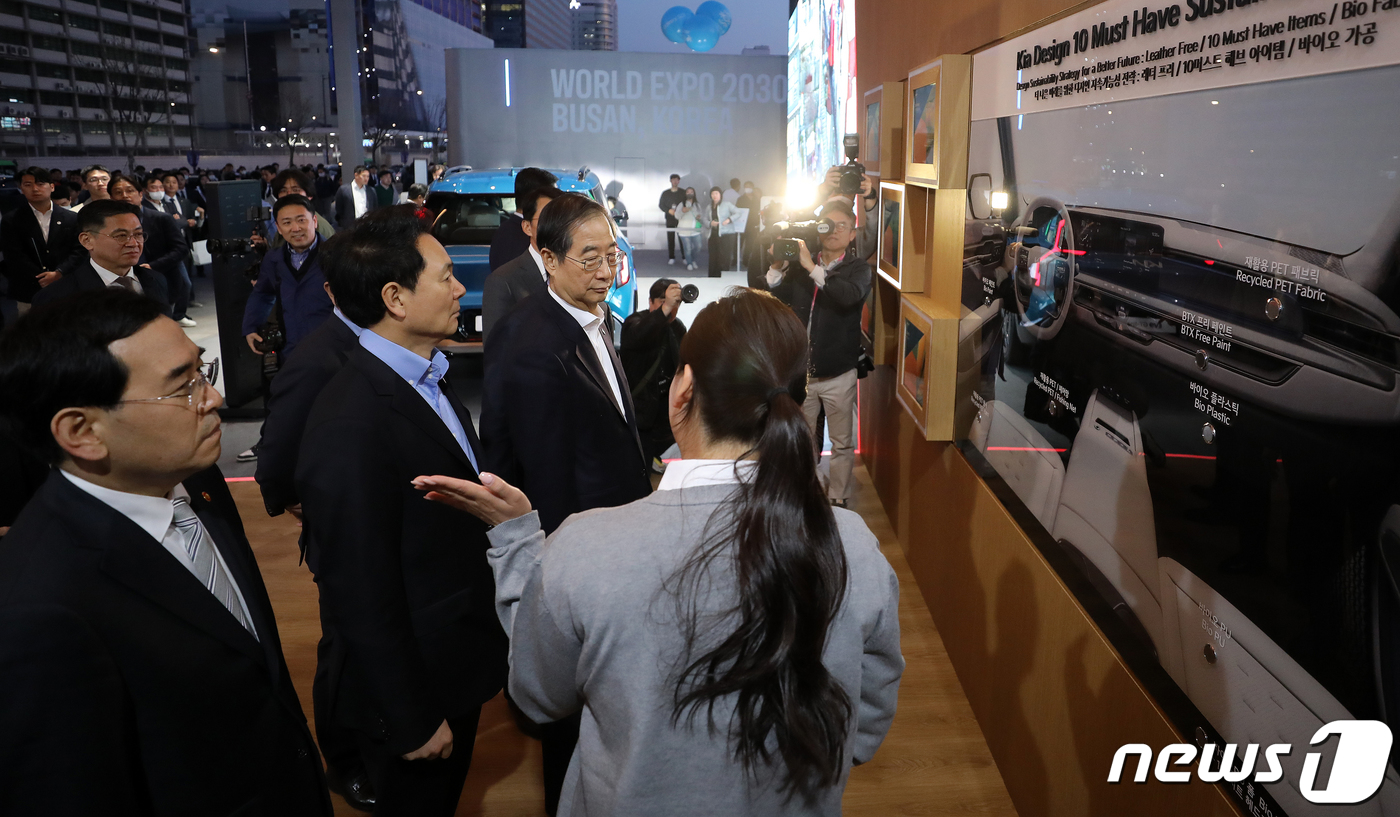 (서울=뉴스1) 김진환 기자 = 한덕수 국무총리를 비롯한 참석자들이 30일 오후 서울 종로구 광화문 광장에 마련된 2030 부산세계박람회(EXPO) 유치 기원 점등식을 마친 기아 부스를 둘러보고 있다. 2023.3.30/뉴스1