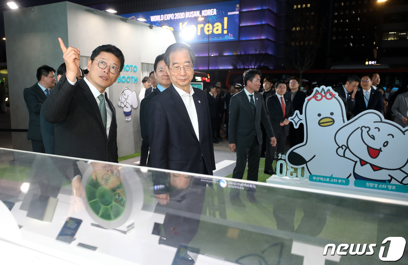 (서울=뉴스1) 김진환 기자 = 한덕수 국무총리를 비롯한 참석자들이 30일 오후 서울 종로구 광화문 광장에 마련된 2030 부산세계박람회(EXPO) 유치 기원 점등식을 마친 뒤 SK 부스를 방문, 저탄소 친환경 사업에 대한 설명을 듣고 있다. 2023.3.30/뉴스1