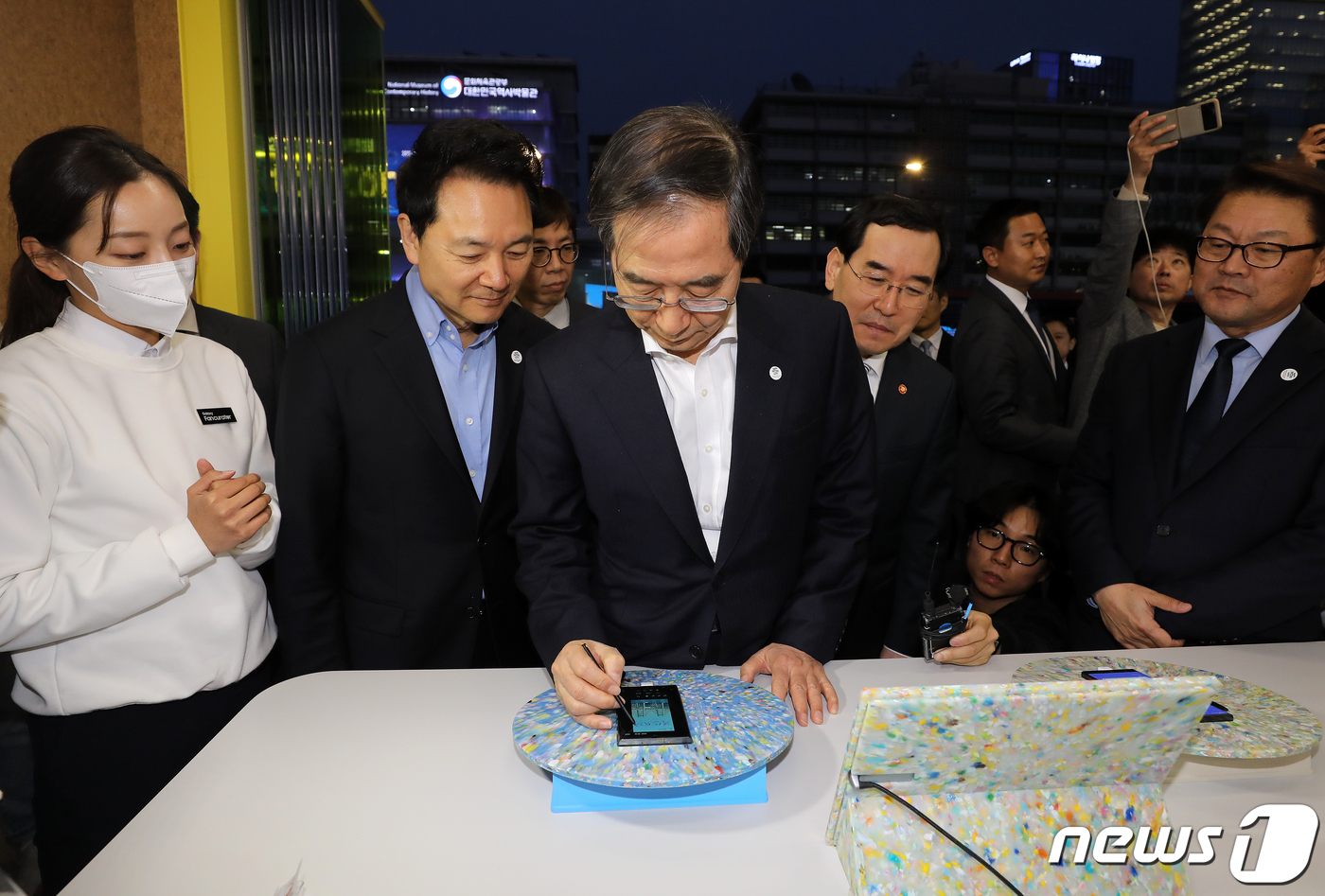 (서울=뉴스1) 김진환 기자 = 한덕수 국무총리를 비롯한 참석자들이 30일 오후 서울 종로구 광화문 광장에 마련된 2030 부산세계박람회(EXPO) 유치 기원 점등식을 마친 뒤 삼성전자 부스를 방문, 갤럭시 S23에 메시지를 남기고 있다. 2023.3.30/뉴스1