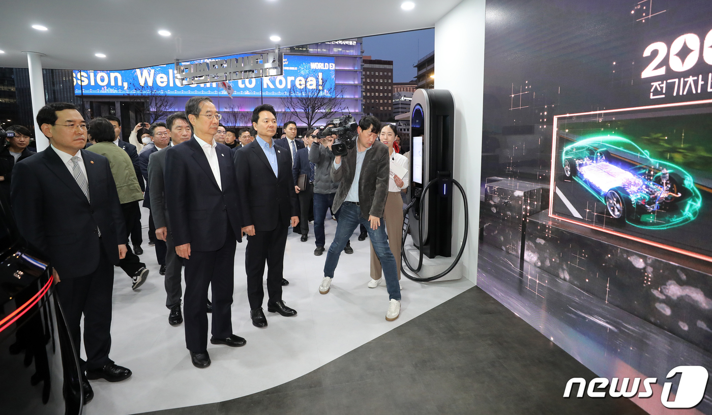 (서울=뉴스1) 김진환 기자 = 한덕수 국무총리를 비롯한 참석자들이 30일 오후 서울 종로구 광화문 광장에 마련된 2030 부산세계박람회(EXPO) 유치 기원 점등식을 마친 LG전자 부스를 둘러보고 있다. 2023.3.30/뉴스1