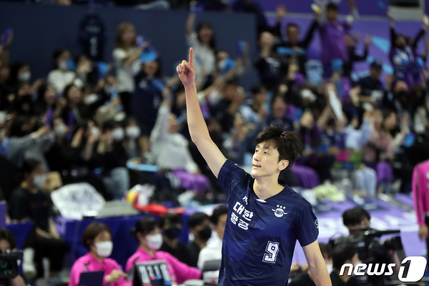 (인천=뉴스1) 황기선 기자 = 30일 오후 인천 계양체육관에서 열린 프로배구 도드람 2022-2023 V리그 챔피언결정전 1차전 남자부 대한항공과 현대캐피탈의 경기에서 득점에 성공한 대한항공 곽승석이 기뻐하고 있다. 2023.3.30/뉴스1