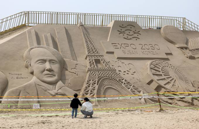 부산 해운대해수욕장에 2030세계박람회 유치를 기원하고 국제박람회기구(BIE) 실사단 방문을 환영하는 모래 작품이 설치돼 있습니다. 7m 높이의 모래 작품에는 토머스 에디슨, 에펠탑 등 조각돼 있습니다. 4월부터 시민들에게 개방될 예정이며 작품 위에서 해운대해수욕장을 한눈에 조망 할 수 있습니다.