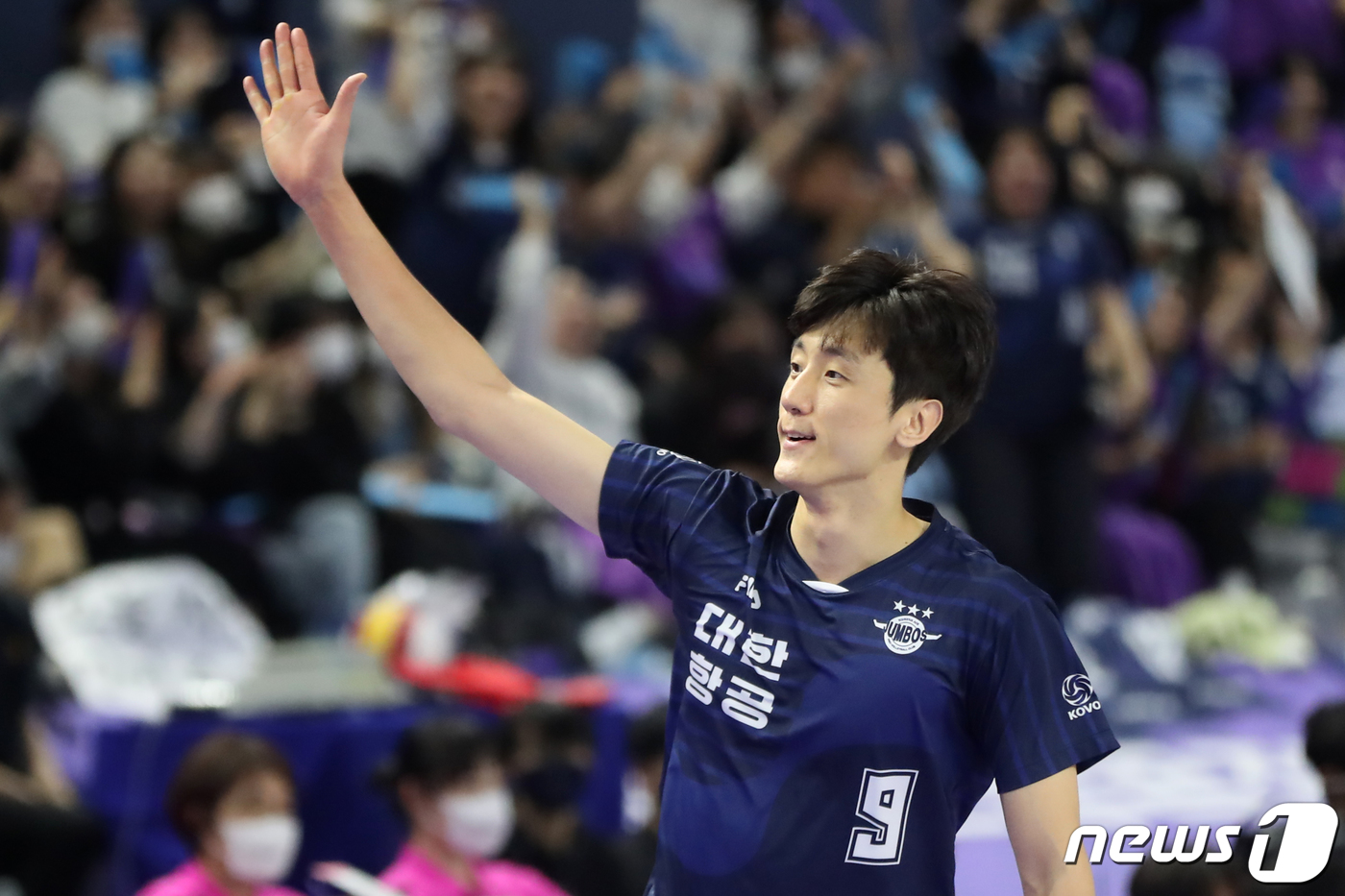 (인천=뉴스1) 황기선 기자 = 30일 오후 인천 계양체육관에서 열린 프로배구 도드람 2022-2023 V리그 챔피언결정전 1차전 남자부 대한항공과 현대캐피탈의 경기에서 득점에 성공한 대한항공 곽승석이 기뻐하고 있다. 2023.3.30/뉴스1