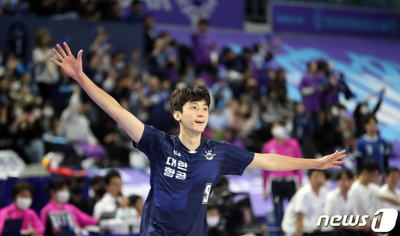 (인천=뉴스1) 황기선 기자 = 30일 오후 인천 계양체육관에서 열린 프로배구 도드람 2022-2023 V리그 챔피언결정전 1차전 남자부 대한항공과 현대캐피탈의 경기에서 득점에 성공한 대한항공 곽승석이 기뻐하고 있다. 2023.3.30/뉴스1