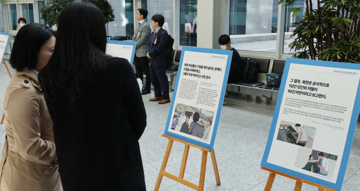 북 인권 실태 전시 ‘북한 인권을 위한 국제사회의 노력과 북한 여성 인권 실태 전시회’가 30일 국회 의원회관에서 태영호 국민의힘 의원실 주최로 열리고 있다. 연합뉴스 |