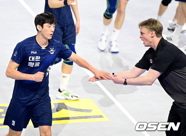 3세트 막판 대한항공 곽승석과 틸리카이넨 감독이 득점에 기뻐하고 있다. 2023.03.30 / dreamer@osen.co.kr