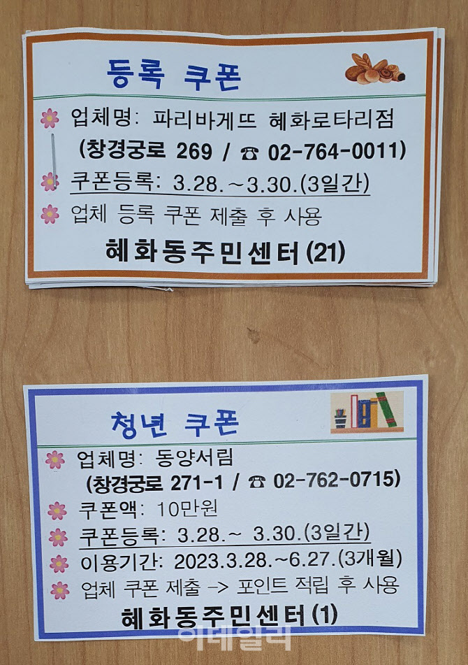 쿠폰은 혜화동 소재 업체와 연계해 최대 3개월 동안 밀키트 가게나 반찬 가게, 베이커리, 서점 등에서 사용할 수 있다.