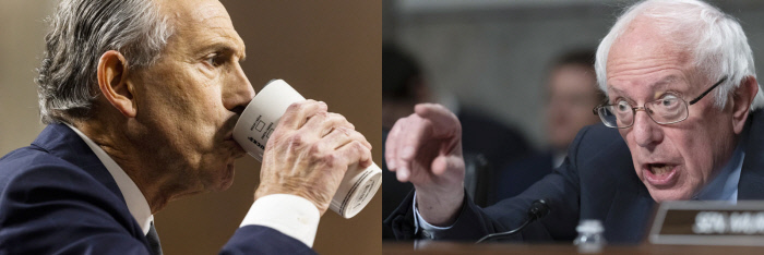 스타벅스 창업주 하워드 슐츠 전 최고경영자(CEO)가 29일(현지시간) 미국 워싱턴 연방의사당에서 열린 스타벅스 사측의 노조 탄압 의혹 규명을 위한 상원 보건·교육·노동·연금위원회 청문회에 참석해 물을 마시고 있다(왼쪽 사진). 버니 샌더스 위원장이 이날 슐츠 전 CEO가 노조 결성 과정에서 사측이 보인 행동을 옹호하자 이에 대해 반박하고 있다. EPAAP연합뉴스 |