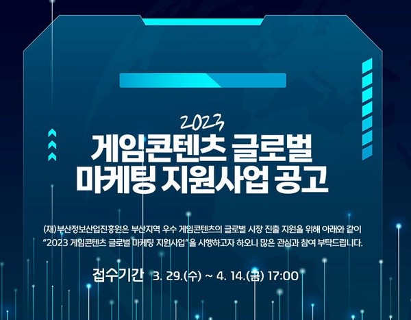 부산정보산업진흥원(원장 정문섭)은 내달 14일까지 '2023 게임콘텐츠 글로벌 마케팅 지원사업'에 참여할 부산 게임기업을 모집한다고 30일 밝혔다.