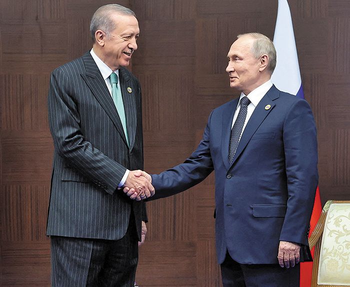 블라디미르 푸틴(오른쪽) 러시아 대통령과 레제프 타이이프 에르도안 튀르키예 대통령이 지난해 10월 13일(현지 시각) 카자흐스탄 아스타나에서 열린 정상회담에 앞서 악수를 나누고 있다./로이터 연합뉴스 |