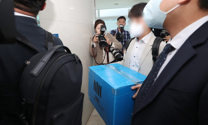 검찰이 박영수 전 국정농단 사건 특별검사에 대해 강제수사에 나서며 이른바 '대장동 50억 클럽' 수사를 본격화한 30일 서울 서초구 양재식 변호사 사무실에서 압수수색을 마친 검찰 관계자들이 압수품을 옮기고 있다. 연합뉴스 |