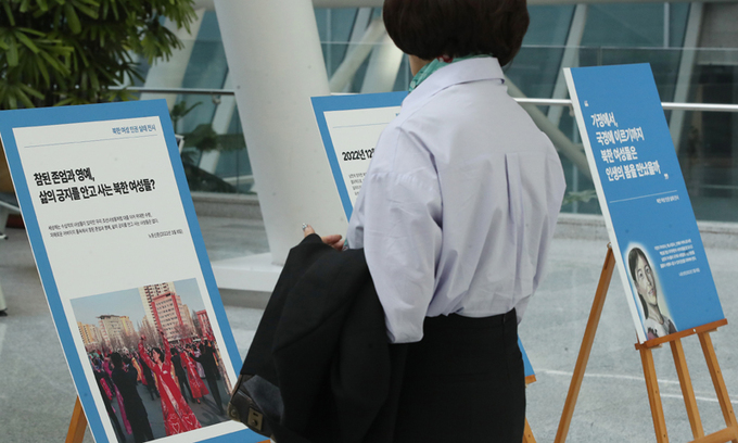 30일 서울 영등포구 여의도 국회 의원회관에서 열린 북한인권 위한 국제사회의 노력과 북한여성인권 사진 전시회에서 참석자가 북한 인권 문제 관련 전시물을 살펴보고 있다. 뉴스1 |
