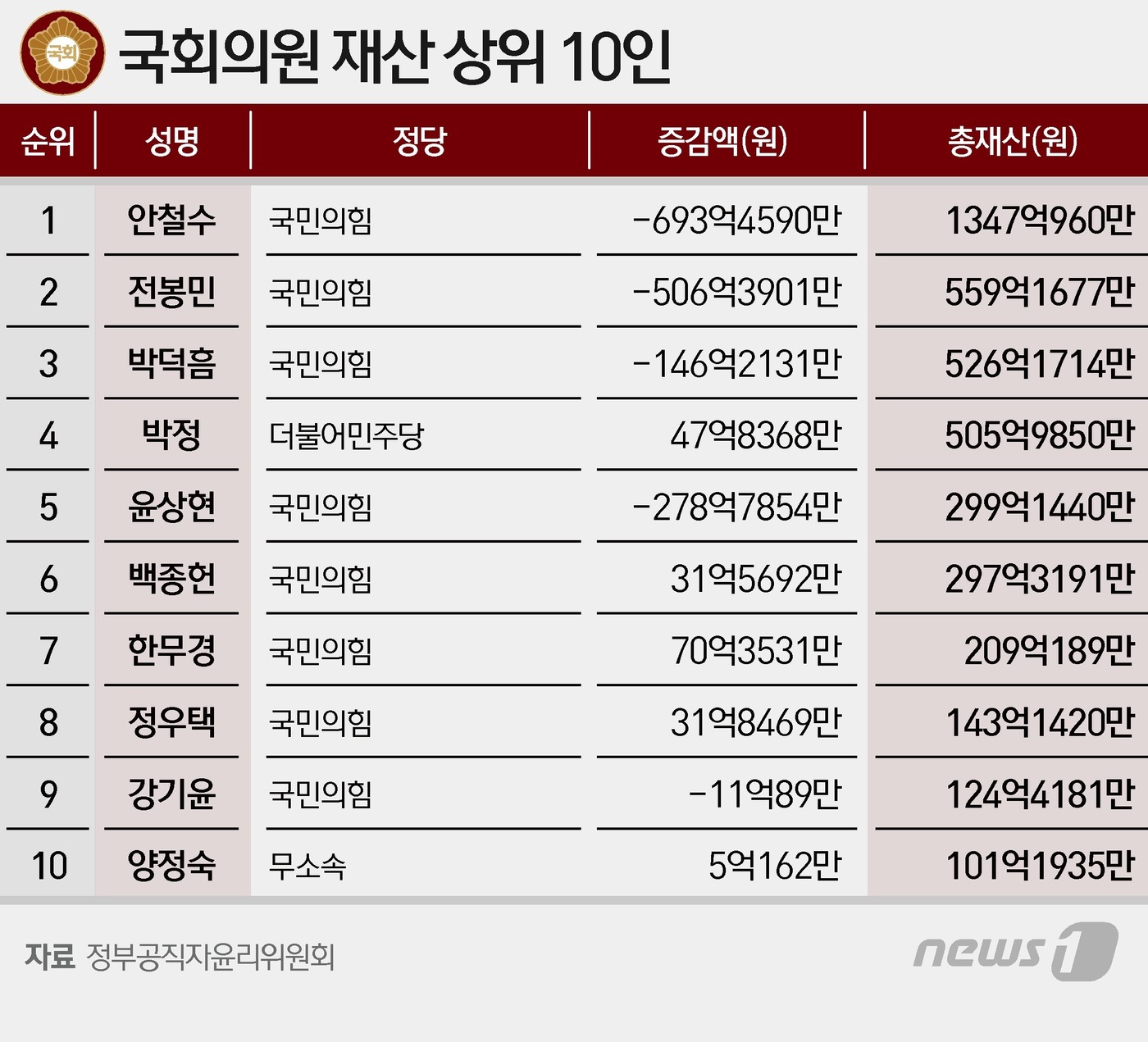 7위 한무경 국민의힘 의원은 사인간 채권 95억원, 건물 87억167만원, 예금 14억9004만원 등 209억189만5000원을, 8위 정우택 국민의힘 의원은 예금 94억8481만원 등 143억1420만4000원을 신고했다.