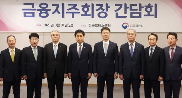 31일 프레스센터에서 열린 금융당국-금융지주회장 간담회에서 참석자들이 기념 사진 촬영을 하고 있다. 왼쪽부터 양종희 KB금융지주 부회장, 함영주 하나금융지주 회장, 이석준 농협금융지주 회장, 김주현 금융위원장, 이복현 금융감독원장, 임종룡 우리금융지주 회장, 진옥동 신한금융지주 회장, 김광수 은행연합회장. 연합뉴스