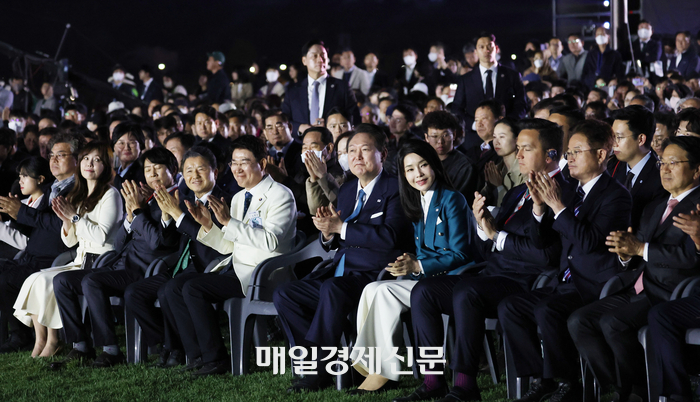 윤석열 대통령과 김건희 여사가 31일 전라남도 순천시 순천만국가정원에서 열린 ‘2023 순천만국제정원박람회 개막식’에서 박수치고 있다. 2023.3.31 [순천/이승환기자]