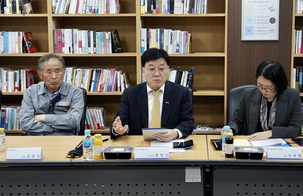 한국무역협회가 10일 경북 경산시 소재 일지테크 본사 회의실에서 정만기 부회장 주재로 ‘수출 확대를 위한 대구·경북 무역업계와의 간담회’를 개최하고 있다. [무협 제공] |