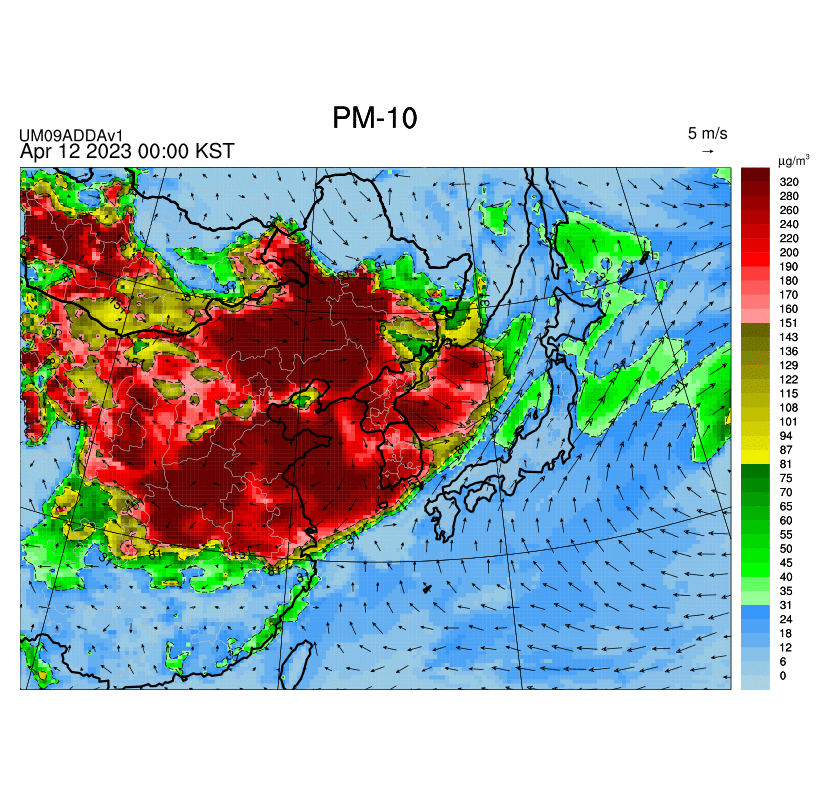 중국발 황사의 영향으로 12일 오전 전국 17개 시도에서 미세먼지가 ‘매우 나쁨’ 수준을 기록했다. 환경부는 전국 황사위기경보 단계를 이날 오전 7시를 기해 ‘관심’에서 ‘주의’로 격상했다. 주의 단계는 ‘황사 때문에 미세먼지 경보가 내려지고 대규모 재난이 발생할 가능성이 나타날 때’ 내려진다.