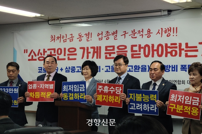 소상공인연합회(소공연)는 12일 서울 여의도 소공연 대회의실에서 2024년 최저임금 요구안 발표 기자회견을 열고 최저임금 동결과 업종별 차등적용, 주휴수당 폐지를 주장했다. 내년도 최저임금 결정을 위한 첫 최저임금위원회 전원회의는 오는 18일 열린다. 노동계는 올해 시간당 최저임금 9620원보다 24.7% 높은 1만2000원을 제시한 상태다.